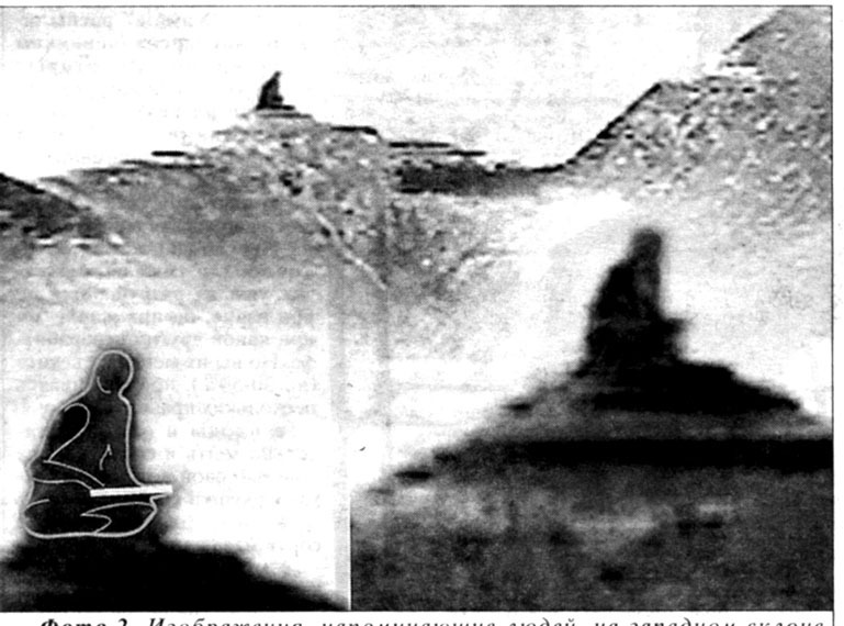 또한 가장 커다란 피라미드의 정상에서, 과학자들은 앉아 있는 사람 형태의 기념물 하나를 발견했다.(사진7) 대략 어림짐작으로도 기념물의 높이는 40미터쯤으로 추정된다(16층 높이다). 사진과 동영상을 컴퓨터로 처리한 결과 그 조상(彫像)은 앞으로 살짝 몸이 기울고, 무릎 위에 뭔가를 놓고(책이나 판) 그것을 읽으며, 붓다의 자세로 “앉아 있다”. 조상의 얼굴은 남동쪽을 향하고 있는데, 그곳은 태평양 영역이다. 전설에 따르면, 그곳에 전설적인 레무리아 대륙이 위치해 있다.