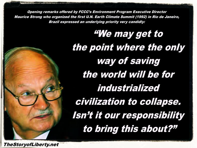 In 1992 Strong stated, "Isn't the only hope for the planet that the industrialized civilizations collapse? Isn't it our responsibility to bring that about?"