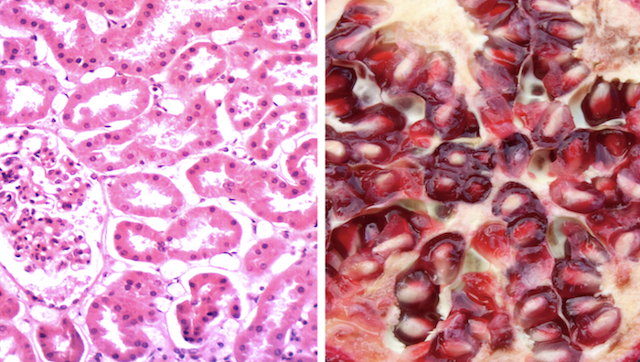 상피 조직은 신체의 내부와 외부를 연결하는 결합 조직을 구성하는 세포의 얇은 층을 의미합니다. 모양이 편평하고 단단히 꽉 짜여진 이 상피는 석류 나무 내부에 붉은 씨가 촘촘하게 닮아 있습니다.