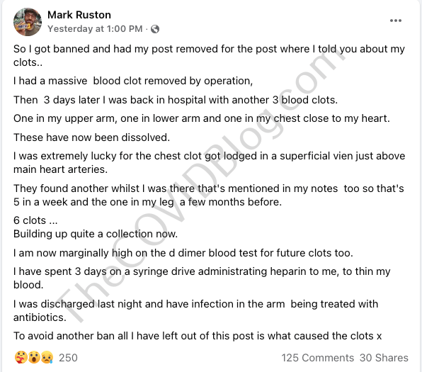 7월이나 8월경에 Ruston 씨는 상태가 나아지지 않아 병원에 입원했습니다. 그의 왼쪽 다리에서 혈전( 심부정맥 혈전증 – DVT )이 발견되었습니다. 우리가 주사 후 DVT가 특히 AstraZeneca 주사 후 폐색전증으로 변하는 많은 이야기를 다루었기 때문에 그는 매우 운이 좋았습니다 . 혈액 희석제는 더 이상의 손상이 일어나기 전에 혈전을 녹였습니다.
