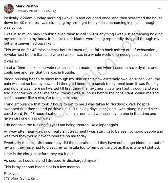 Ruston 씨는 1월 16일 일요일에 고통에 비명을 지르며 일어났다고 말했습니다. "면도날이 내 왼팔을 반복적으로 끌리는 것 같았습니다."라고 그는 썼습니다. 불행히도 일요일이었고 그는 그날 의사를 볼 수 없었습니다. Ruston 씨는 1월 17일 월요일 아침에 구급차를 불렀습니다. 지금쯤 그의 손목 피부는 멍이 들었고 부어올랐습니다. 물론 의사가 가장 먼저 한 것은 소위 COVID-19에 대한 테스트였습니다. 그는 양성 반응을 보였다.