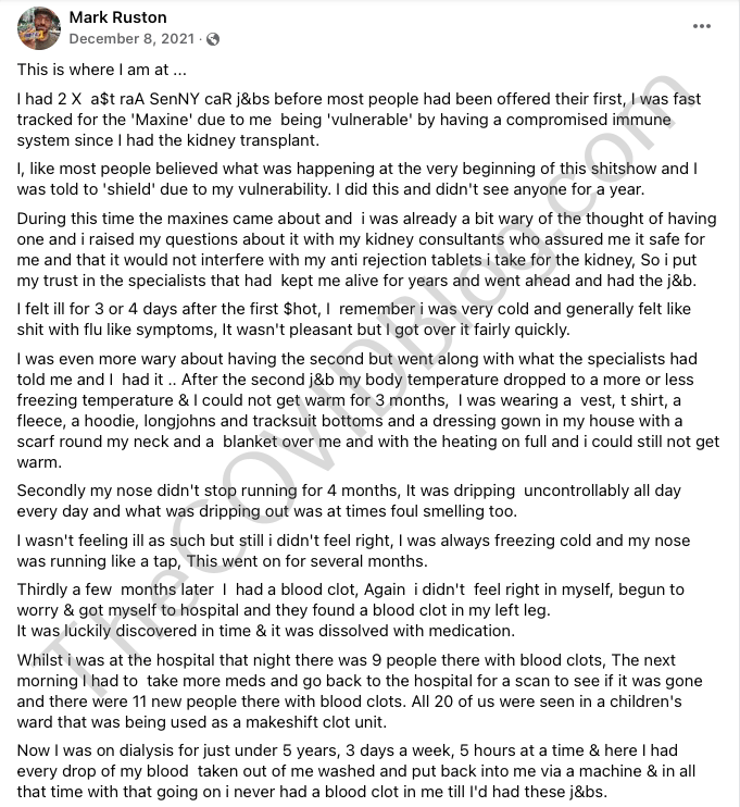 Mr. Ruston은 주사에 대해 회의적이었습니다. 신장 이식 후 수혜자는 면역억제제(항거부제라고도 함) 약물을 복용 해야 합니다. 면역 체계가 바이러스나 다른 외부 침입자처럼 새로운 신장을 공격하지 않도록 합니다. 자신의 주장을 뒷받침하는 데이터나 과학이 없는 의사들은 바이러스 벡터 DNA 주사가 안전하고 그의 신장 요법을 방해하지 않을 것이라고 Mr. Ruston에게 말했습니다. Ruston 씨는 그 의사들이 그를 몇 년 동안 살아 있게 했기 때문에 그를 믿지 않을 이유가 없다고 말했습니다. 이제 그는 13개월에 걸친 그의 포스트 AstraZeneca 공포 이야기를 하고 있습니다.