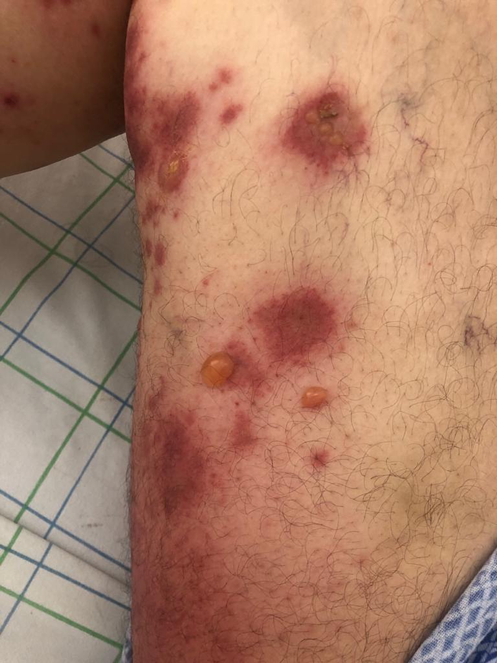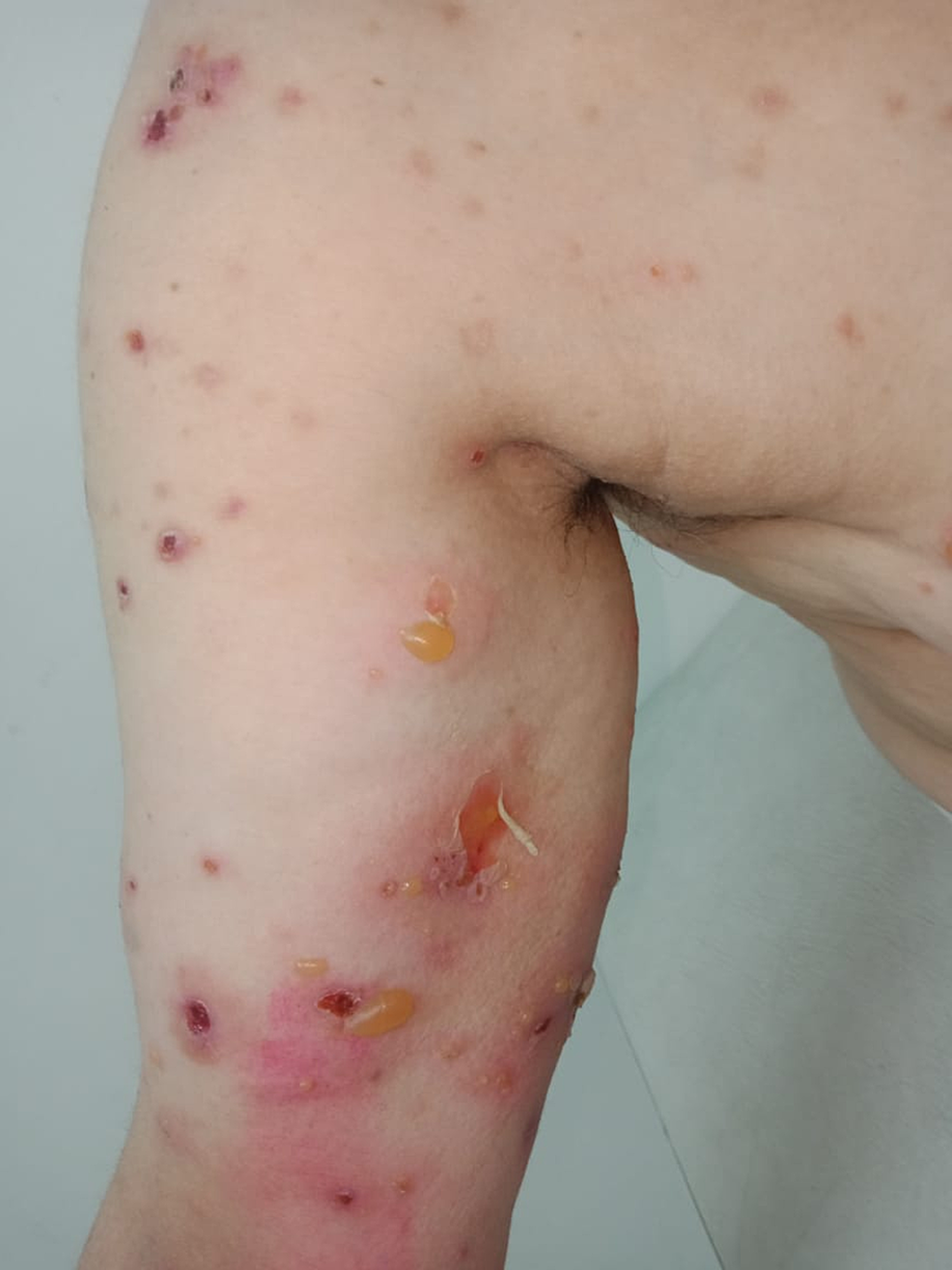 54세 여자가 접종 부위에 광범위한 홍반성 발진과 수포가 발생한 1주일의 병력을 내원하였다. 그녀는 발진이 시작되기 3일 전에 왼쪽 팔뚝에 코로나19 백신(옥스포드 아스트라제네카)의 첫 번째 접종을 맞았습니다. 그녀는 이전에 특별한 병력이 없었습니다. 발진은 작은 국소 수포와 함께 주사 부위에서 시작되었습니다. 그런 다음 왼쪽 팔뚝에서 복부, 등, 다리 아래로 퍼졌습니다. 입원 시 신체 검사에서 양팔, 복부 및 허벅지에 두드러기 플라크와 관련된 긴장된 수포가 나타났고 Nikolsky 징후가 양성이었습니다(그림 3 ).