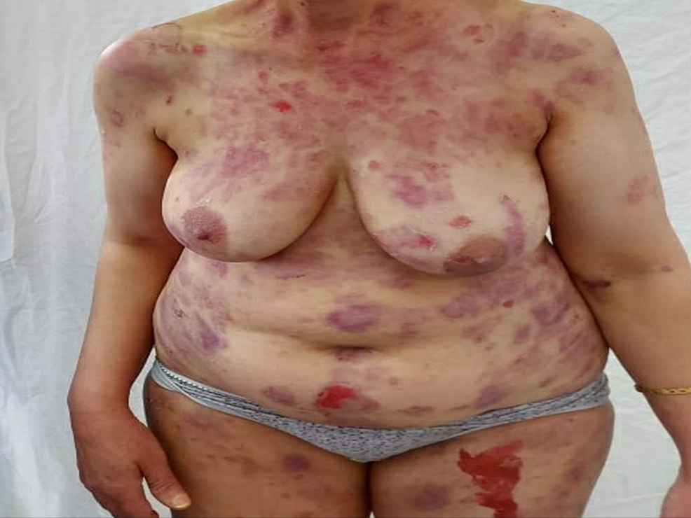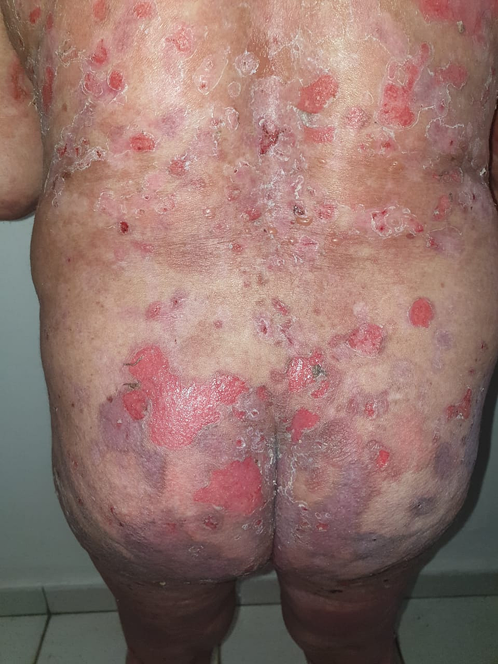 10년 동안 우울증을 앓아온 58세 여성이 화이자/바이오엔텍의 코로나19 백신 1차 접종 1개월 후 전신에 미란이 생겨 입원을 요하는 내원했다. 신체 검사에서 그녀의 얼굴, 몸통, 복부, 등, 엉덩이 및 양쪽 다리에 광범위한 미란성 병변이 나타났습니다(그림 6 ).