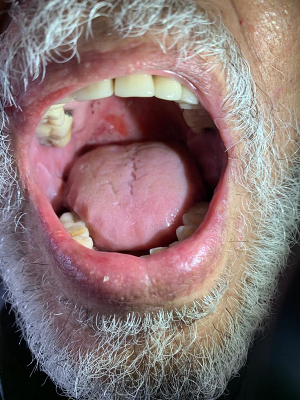 51세 남성이 Oxford AstraZeneca COVID-19 백신의 첫 번째 부스터를 투여한 지 7일 후에 나타난 광범위한 수포성 발진의 관리로 입원했습니다. 특별한 병력은 없었고 다른 약물을 복용하고 있지 않았습니다. 임상 검사에서 몸통, 등 및 다리의 두드러기 플라크와 관련된 미만성 긴장 수포의 존재가 나타났습니다. 수포 후 미란과 피부 표면의 70%에 영향을 미치는 코카드 같은 병변이 관찰되었습니다. Nikolsky 기호는 양수였습니다(그림 1 ). 환자는 또한 협측 점막에 여러 번의 미란이 있었습니다(그림 2 ).
