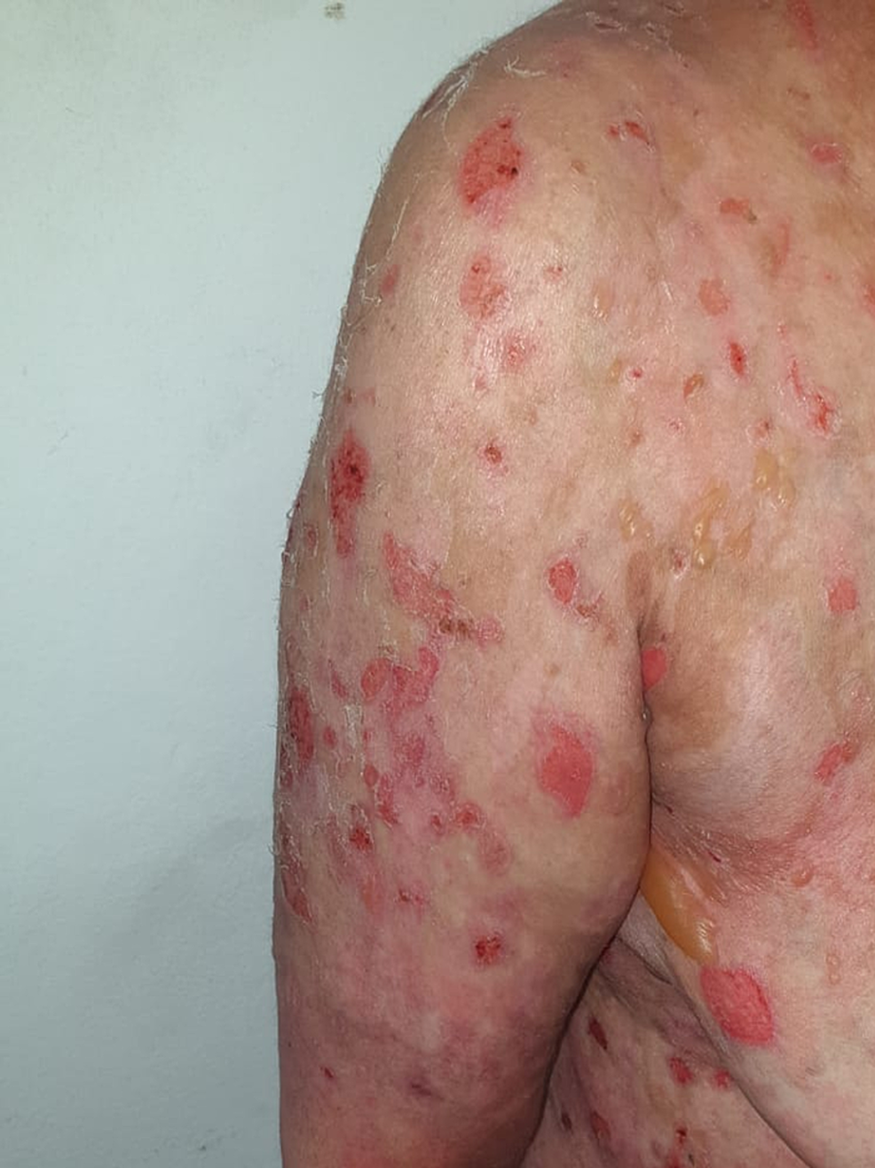 환자는 68세 남자로 20년 동안 고콜레스테롤혈증의 병력이 있었고 다른 특별한 개인 또는 가족력은 없었다. Oxford AstraZeneca COVID-19 백신의 첫 번째 접종을 받은 지 2주 후, 그는 접종 부위에 물집이 생겼고, 처음에는 외상 후 병변으로 오진되었습니다. 첫 번째 접종 후 3주 이내에 접종한 부스터 백신을 접종한 지 7일 만에 팔다리와 몸통에 새로운 물집이 생겨 증상이 악화되었습니다. 신체 검사에서 몸통과 팔다리의 직경 3-10cm를 측정하는 홍반성 기저부에서 긴장된 수포와 수포 후 미란이 발견되었으며 Nikolsky 징후가 양성이었습니다(그림 4 ).